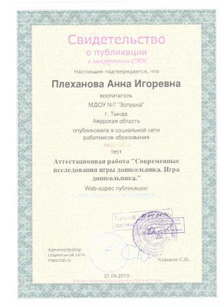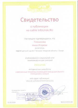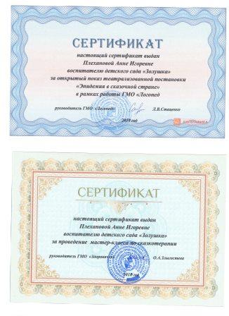 Квалификация:Воспитатель детейдошкольного возраста, воспитатель дошкольных учреждений для детей с недостатками умственного и речевого развития."